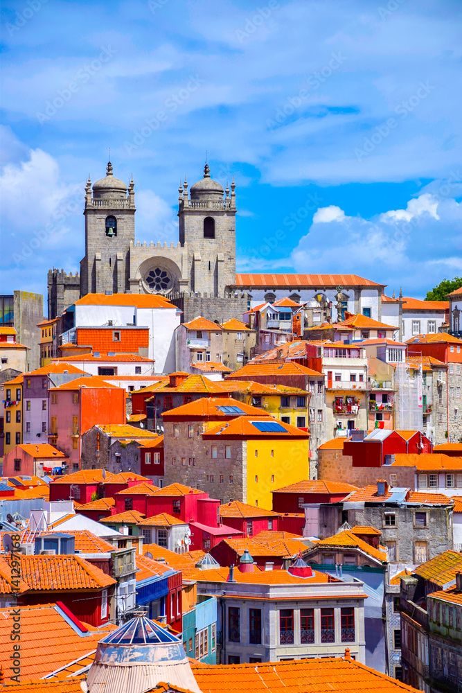 View over the old town of Porto, Portugal with the cathedral, colorful buildings and orange roofs
