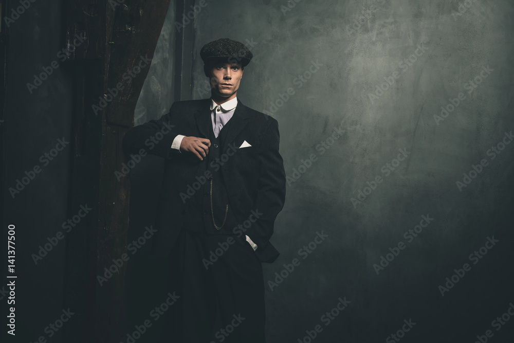 Retro 1920s english gangster wearing suit and flat cap.