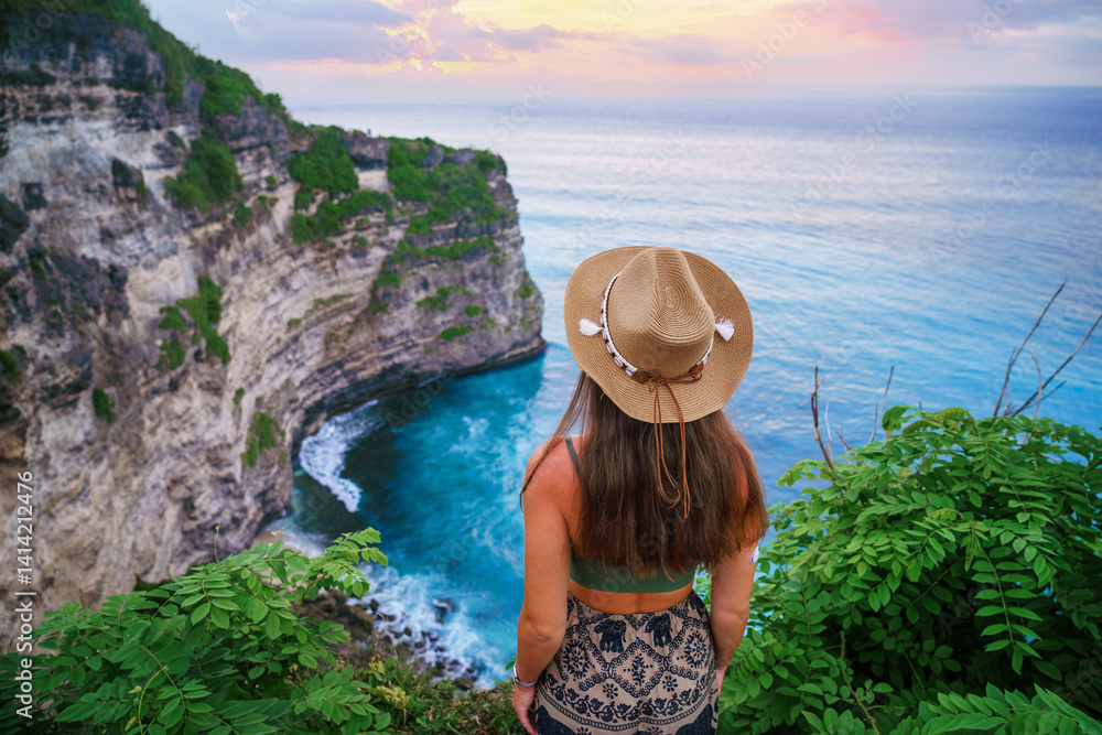 Traveler girl wearing hat enjoys turquoise stunning ocean view on cliff during traveling at beautiful destination on Bali island, Indonesia