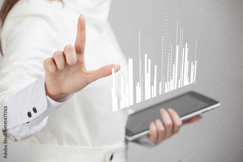 Finance data concept. Woman working with Analytics. Chart graph information on digital screen.