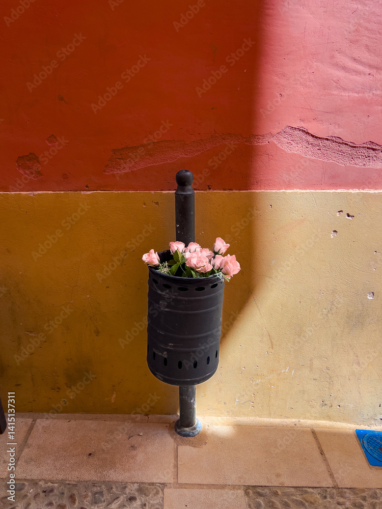 A black trash can filled with thrown away Flower bouquet is affixed to a textured wall. The backdrop features warm hues of orange and yellow, creating a vibrant urban detail.