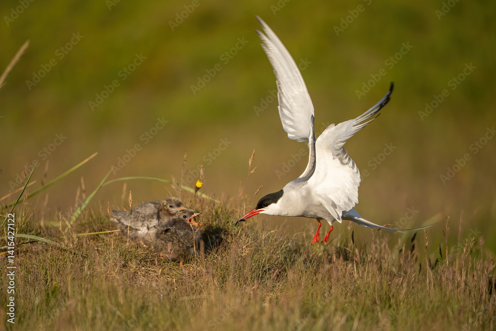 Arctic tern (Sterna paradisaea). Tern delivering prey to hungry chicks. Grassland habitat in golden light. A moment of tenderness and urgency.
