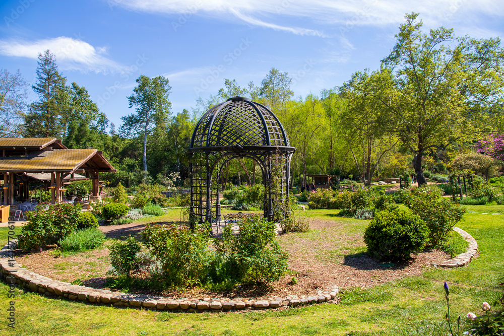 A gazebo in a gorgeous landscape with lush green trees and plants and colorful flowers at Descanso Gardens in La Canada Flintridge California USA