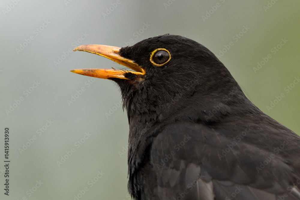 Eurasian blackbird aka The common blackbird or Turdus merula close-up portrait. Singing with open beak in springtime. Funny animal photo.