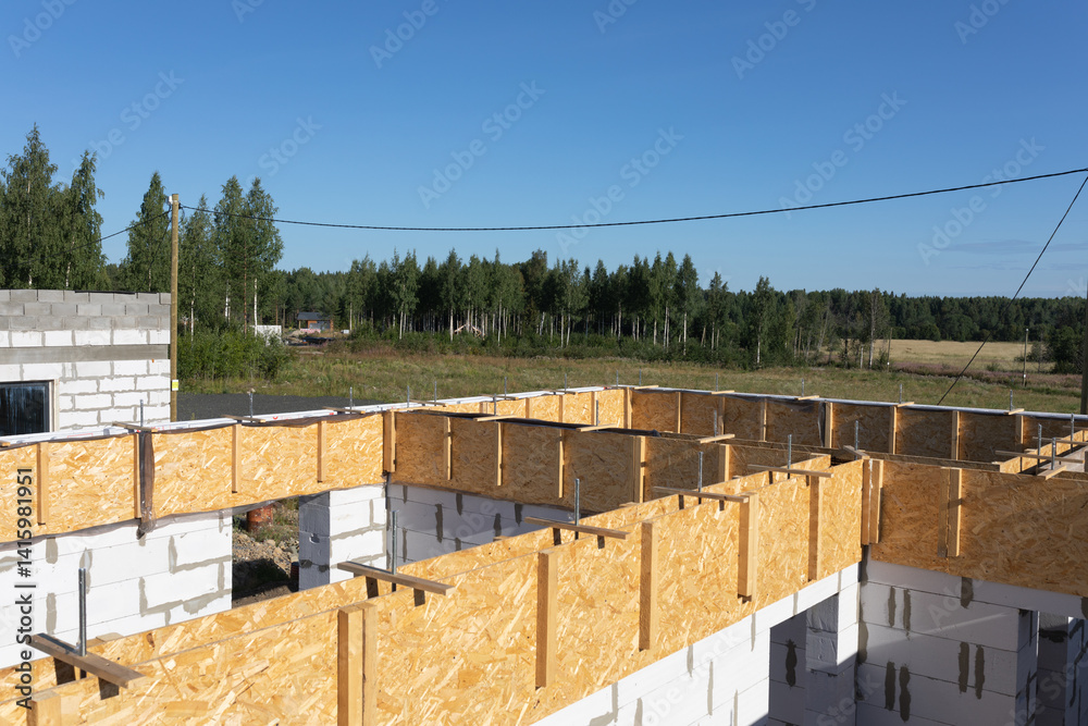 Construction Site in Progress: Wooden Formwork and Rebar for Concrete Foundation with Forest Background