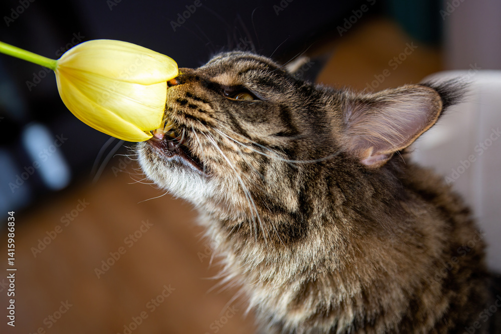 Playful Maine Coon Cat Biting a Yellow Tulip from Bouquet