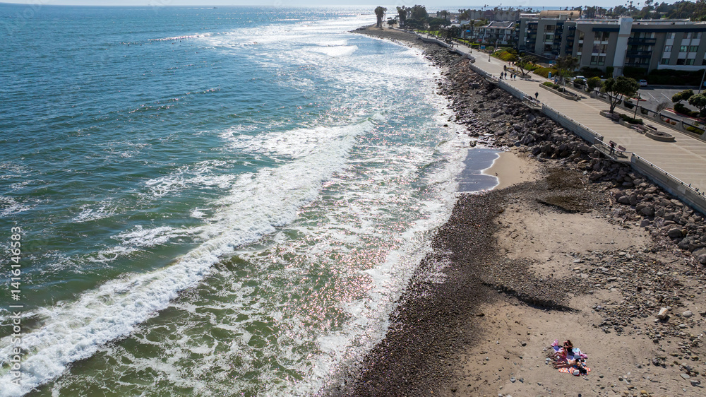 Aerial shot of the coastline at Ventura beach with blue ocean water and waves crashing into the rocks in Ventura California USA
