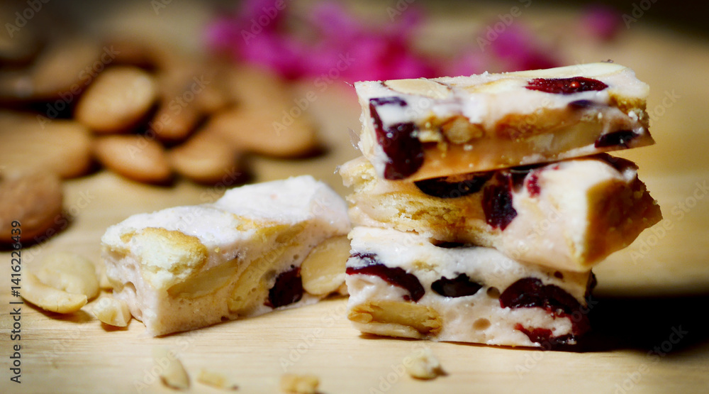 dessert shop Nutty nougat Delicious nougat pieces with nuts and fruit, set on a wooden surface with almonds in the background.