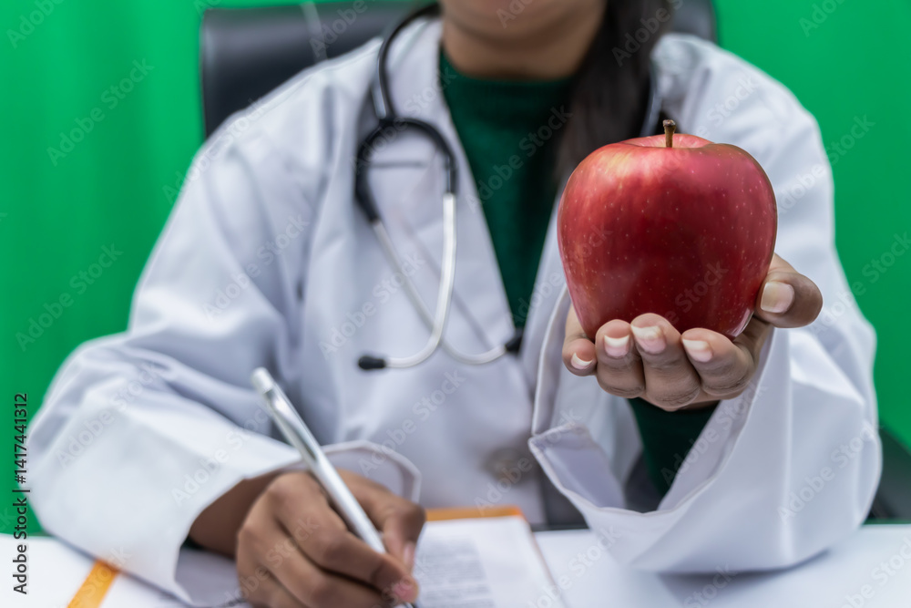 Female doctor offering red apple closeup - Concept of healthy food and nutrition.