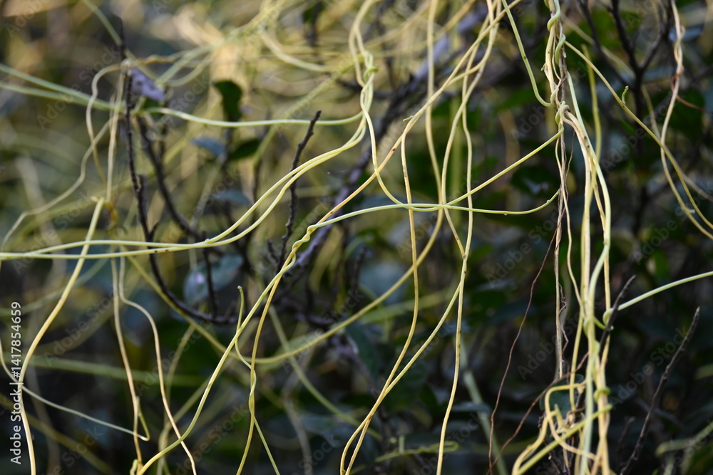 Cuscuta or Dodder plant. It is a genus species of yellow, orange,or red parasitic plants. Its can be identified by its thin stems appearing leafless,with the leaves reduced to minute scales. Amarbel.