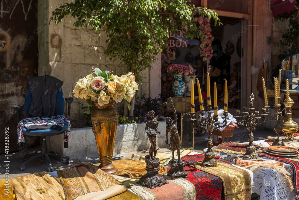 Haifa, Israel, 16 April 2025, Outdoor display of antique and vintage items for sale on tables in front of a shop.