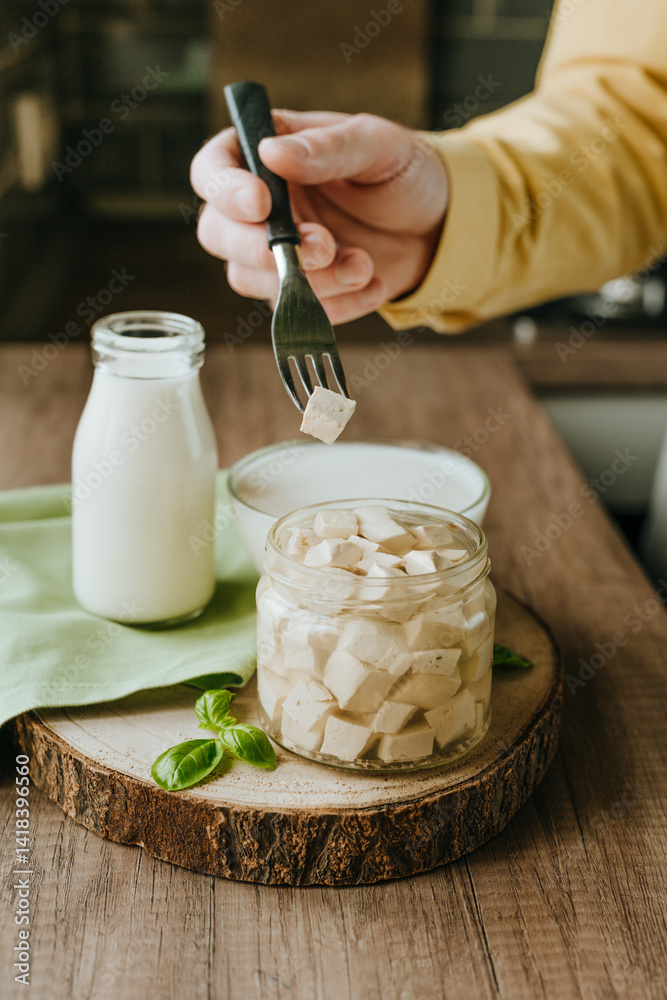 Close up of male hand tasting tofu from jar on a wooden table
