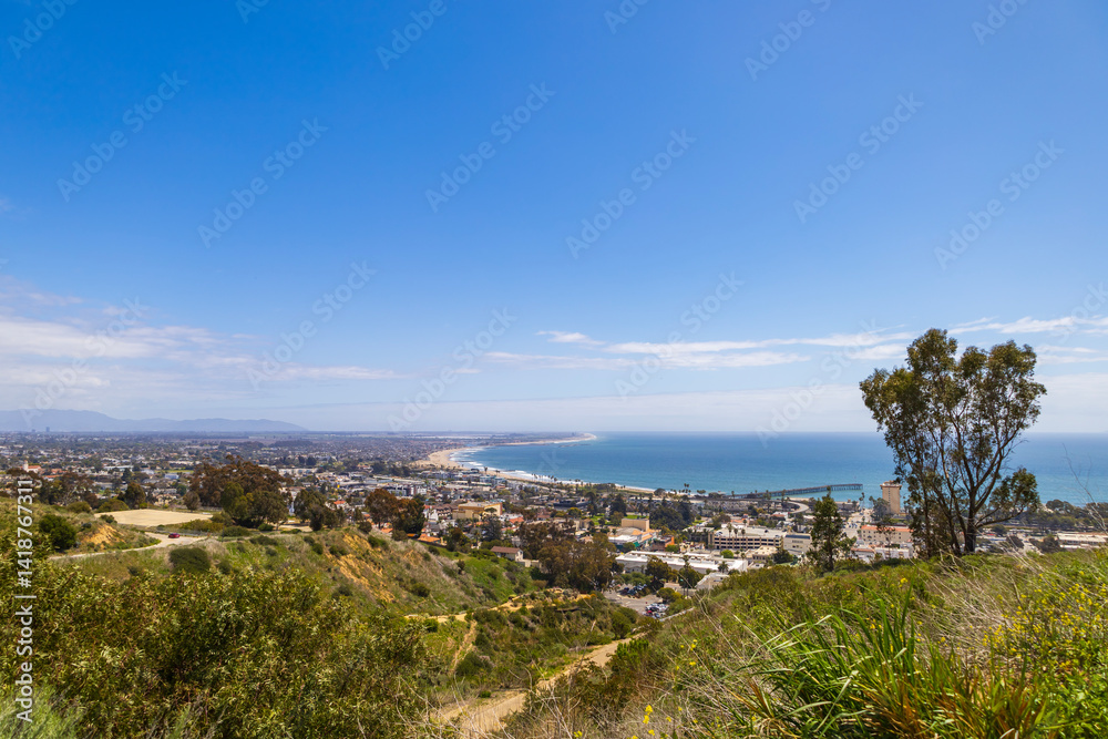 a gorgeous landscape with the pacific ocean, lush green trees, office buildings and homes at the Ventura Botanical Garden in Ventura California USA