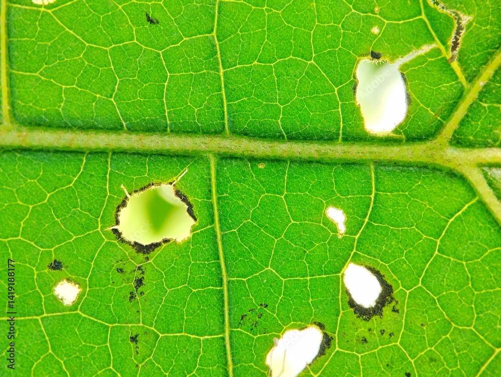 Green leaves with holes due to insect bites. Holey and textured leaves on a blurry background