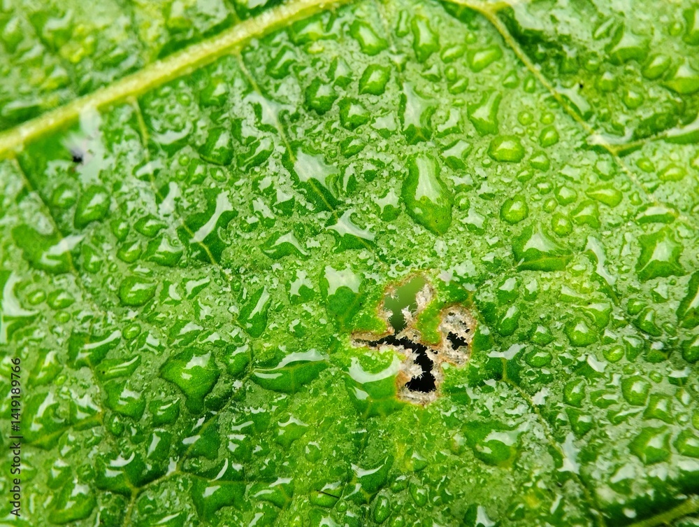 Green leaves with holes due to insect bites. Holey and textured leaves on a blurry background