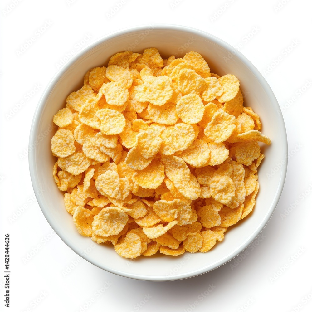 A top down view of a white bowl filled with yellow corn flakes on a white background in bright light