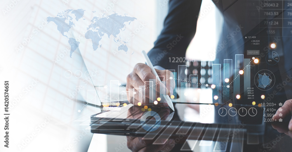 Business, finance and investment concept. Businessman using digital tablet analyzing business report with financial growth graph chart. Business planning, strategy and solution. Market research