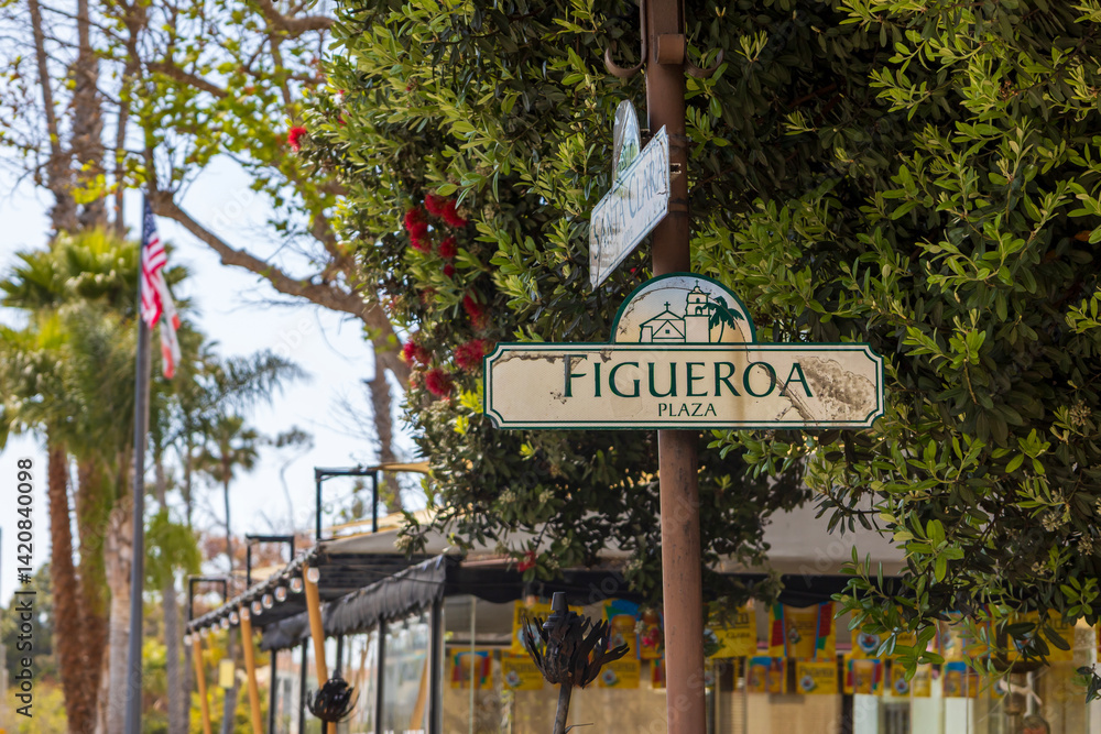 The Figueroa Plaza street sign with lush green trees in downtown in Ventura California USA