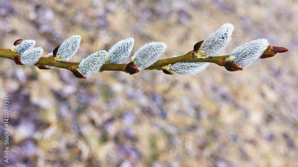 Raindrops glisten on Salix caprea buds during springtime in a natural setting