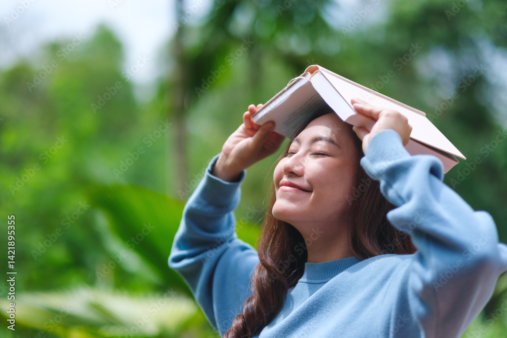 Portrait image of a woman with closed eyes holding and putting a book on her head in the garden