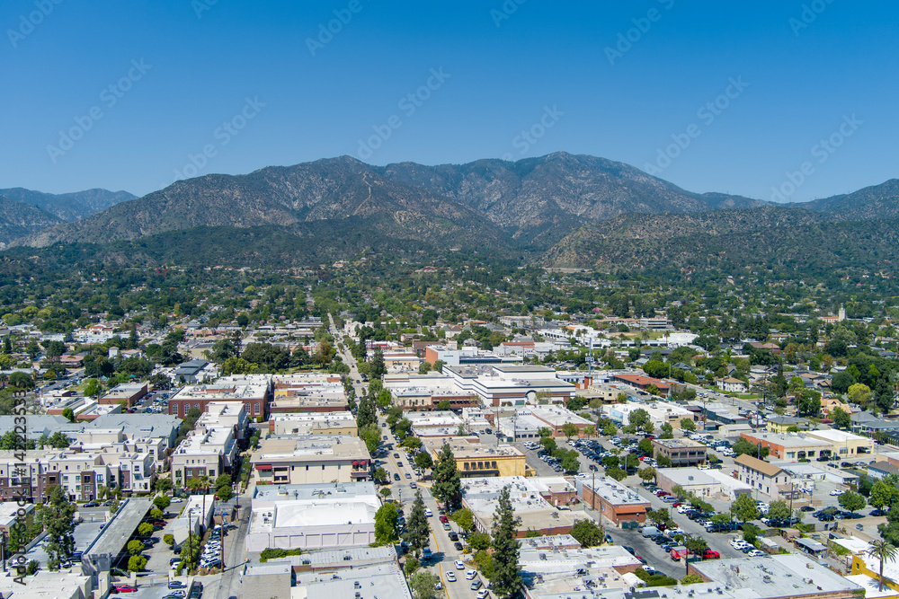 aerial shot of office buildings, apartments, shops and restaurants, majestic mountains and lush green trees in Monrovia California USA