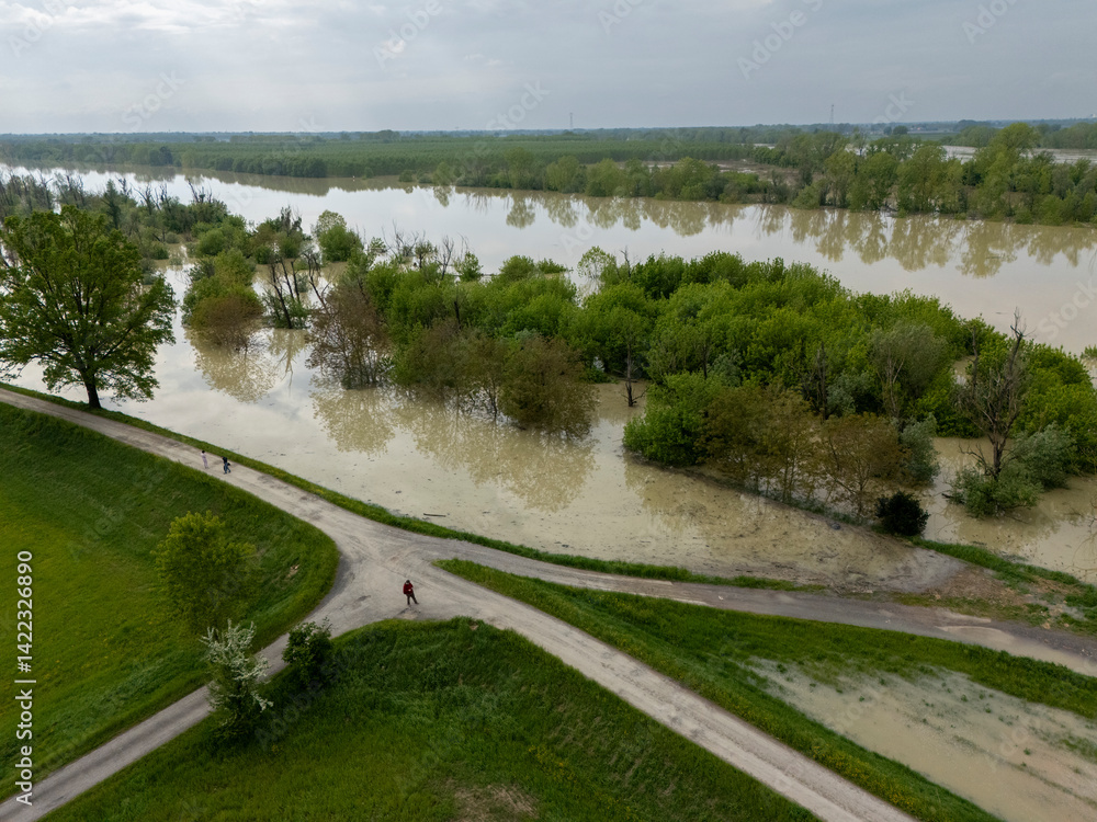 Aerial view capturing the flooded Po River in Emilia Romagna, Italy, with submerged trees and fields illustrating disaster impact