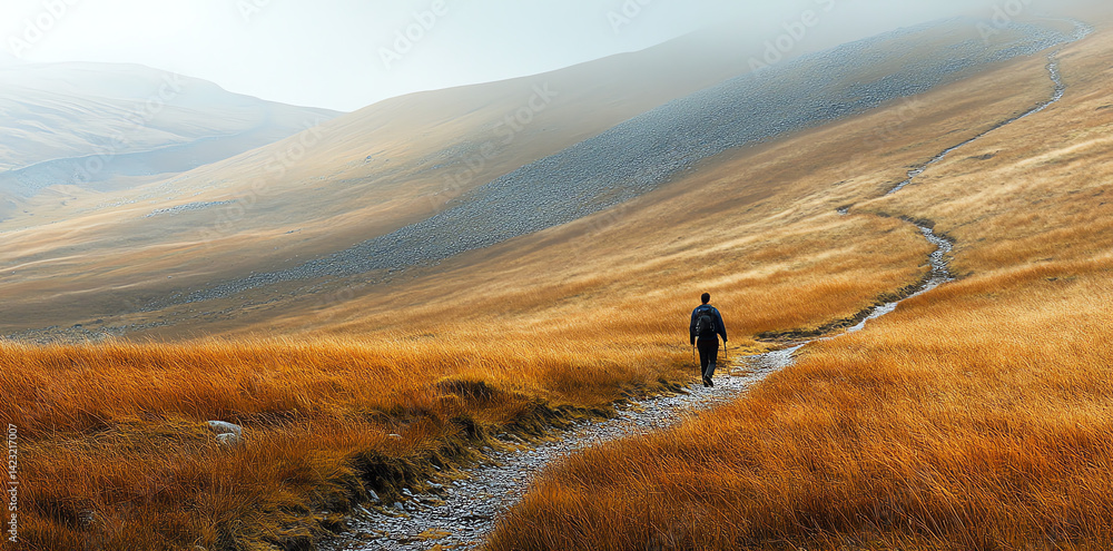 Lone hiker trekking scenic mountain path golden grasses autumn day Perfect for travel adventure and nature themes