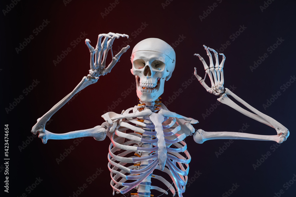 Artificial human skeleton model on dark background in neon lights