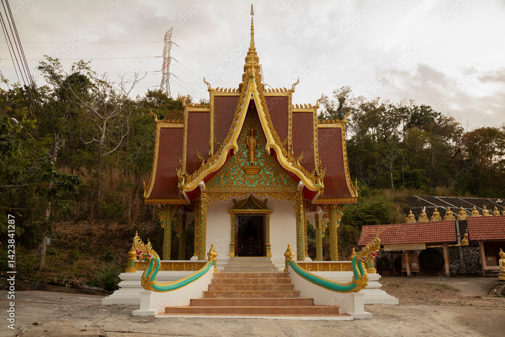 Temple with golden decorative motifs, on the grounds of Wat Phousalao, near Pakse, Champasak, Laos