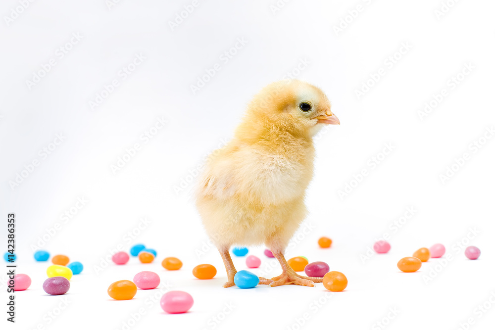 Fluffy yellow new chick with colorful easter jellybeans