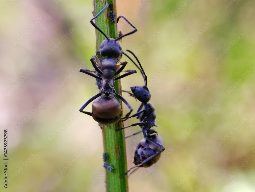 Black ants close up on blurry green background