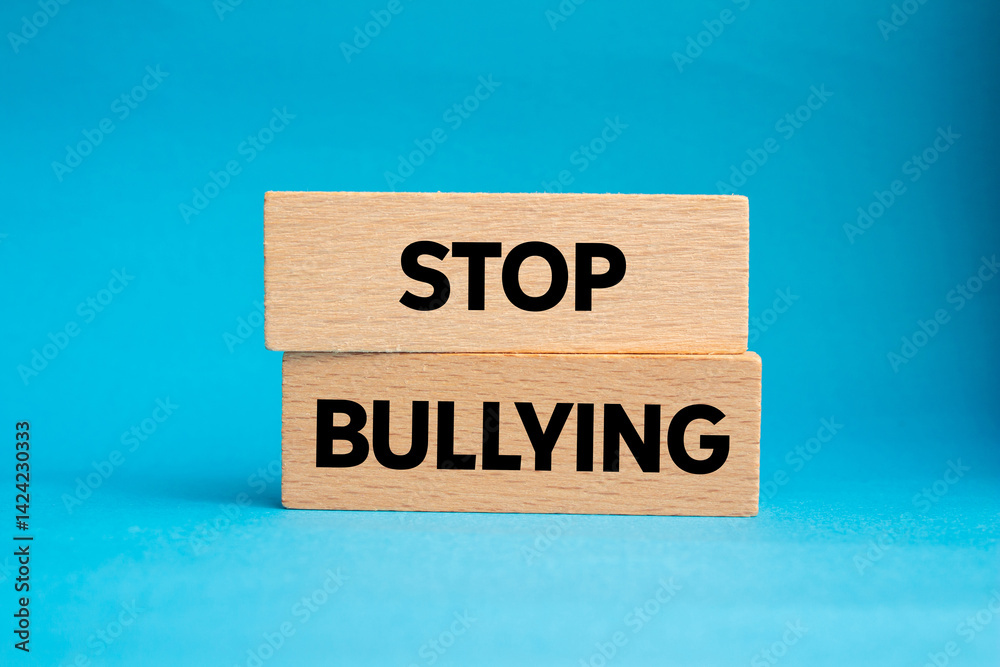 Stop bullying message written on wooden blocks on blue background. Conceptual stop bullying symbol. Copy space.