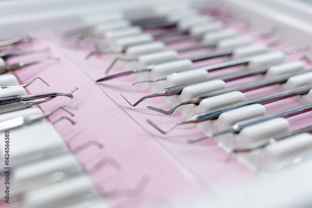 Close-up of sterilised dentist's instruments for working on teeth arranged on medical cabinet. Dental health concept