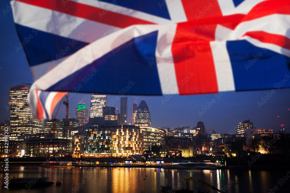 brexit concept - Union Jack flag and iconic London landmarks - UK leavs the EU