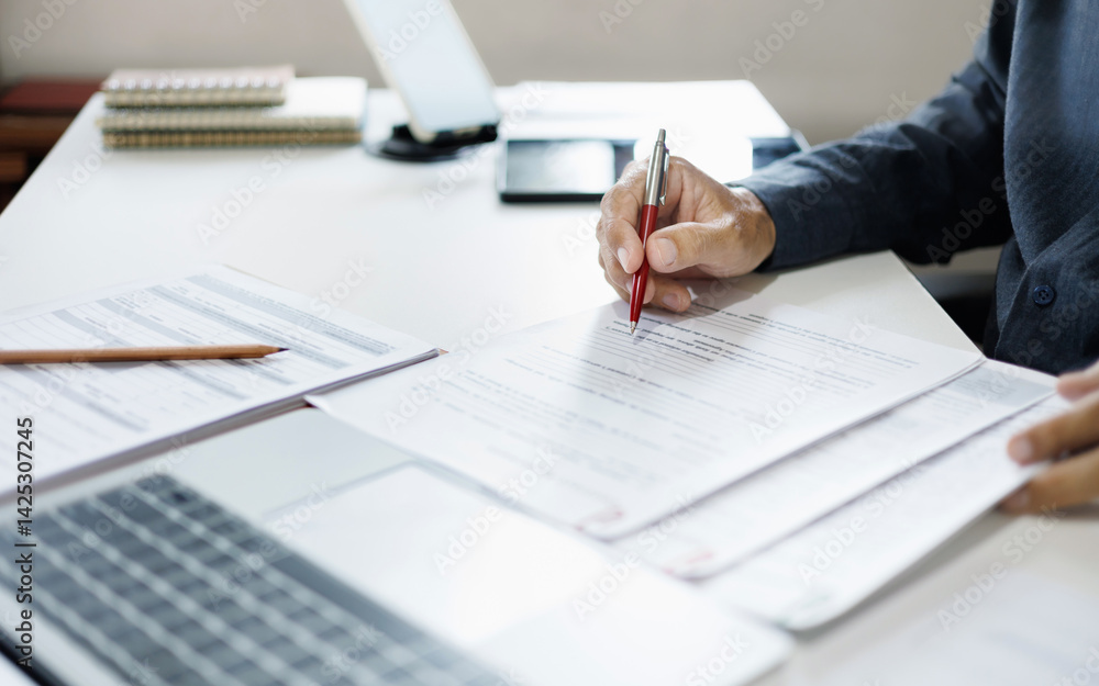 asian businessman working on desk reading and checking financial documents and business contract to make new business plan