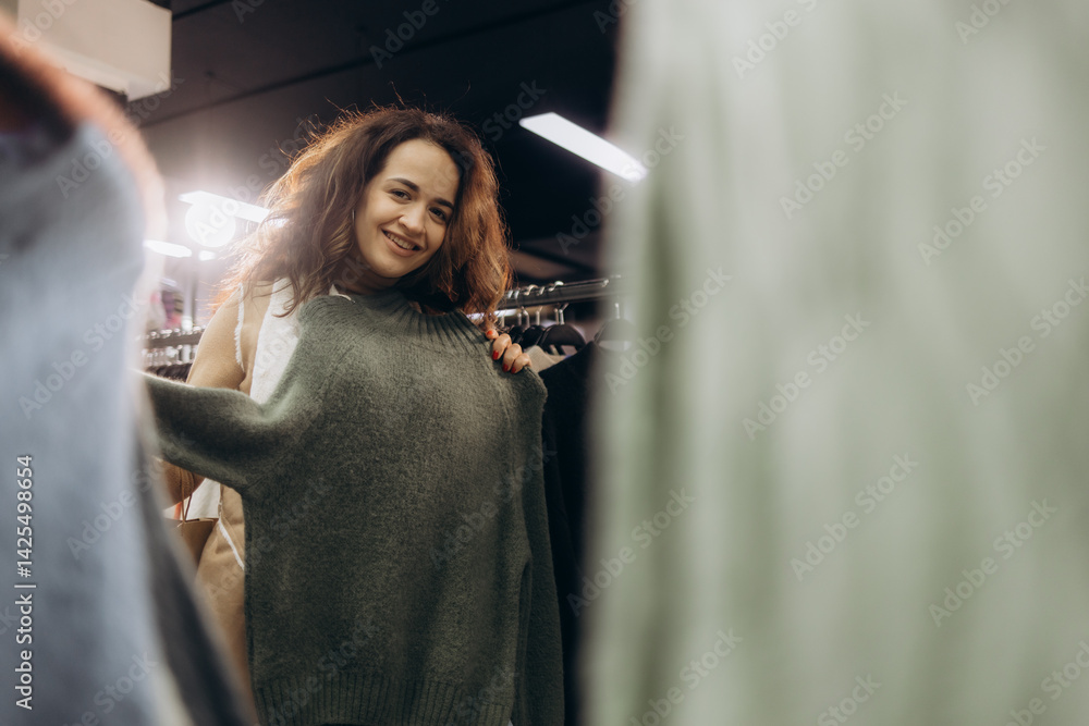 Smiling Woman Shopping and Holding a Green Sweater in a Bright Store