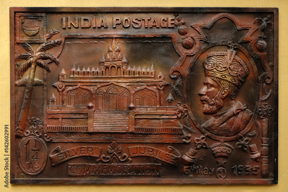 Celebrate silver jubilee of coronation of King George V(1935) British Government issued stamp depicting Sri Sital Nath Jain Temple, relief on the wall of Jain Temple in Kolkata