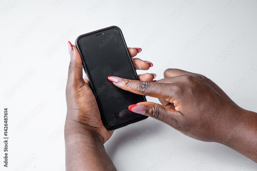 Close-up of a dark-skinned woman’s hands interacting with a smartphone, isolated on a white background