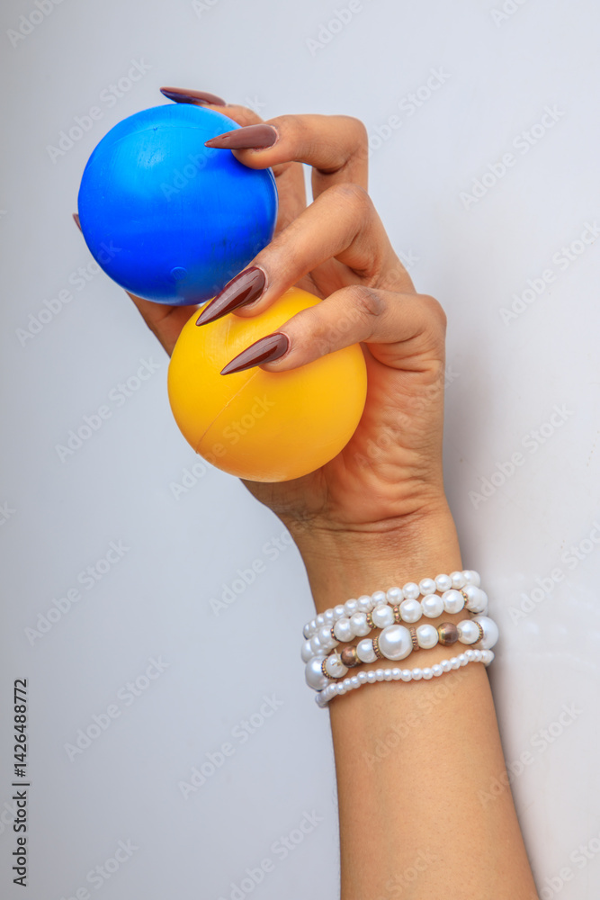 Close-up of a stylish female hand wearing pearl bracelets and holding blue and yellow stress balls. The image is shot against a clean white background, emphasizing wellness, balance, and self-care con