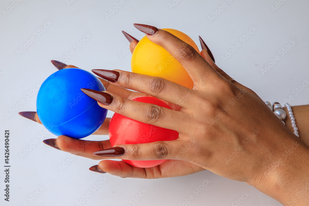 Woman's Hands with Long Brown Nails Holding Colorful Balls and Wearing Pearl Bracelets