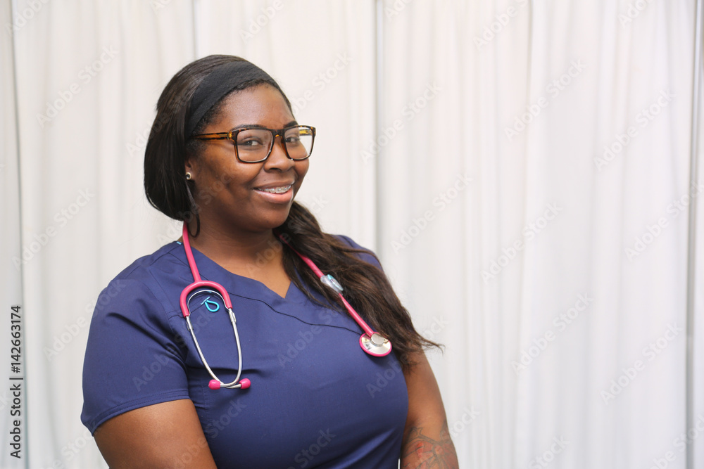 Portrait of a happy African American female healthcare professional, portrait of a nurse with stethoscope