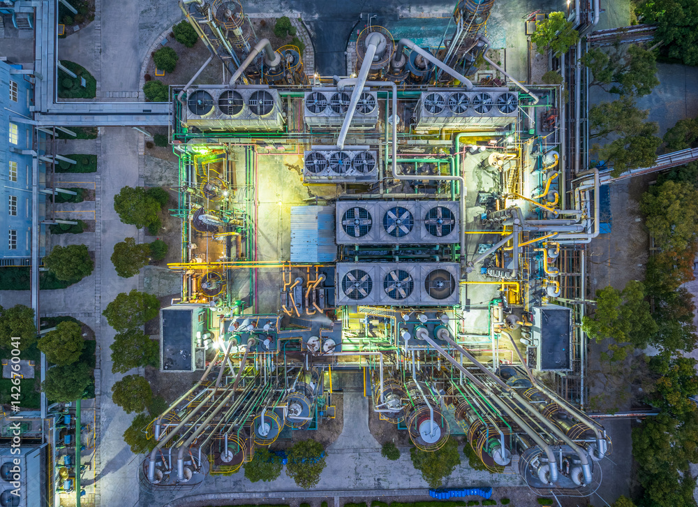 Top down aerial view of illuminated chemical plant industrial complex equipment at night.