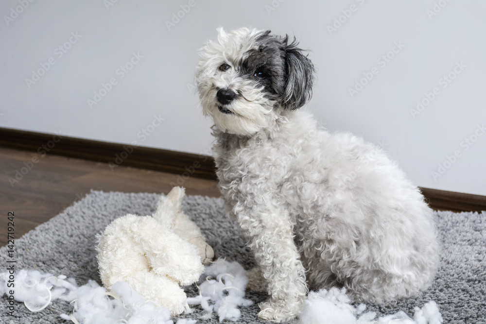 white poodle dog destroyed a plush toy