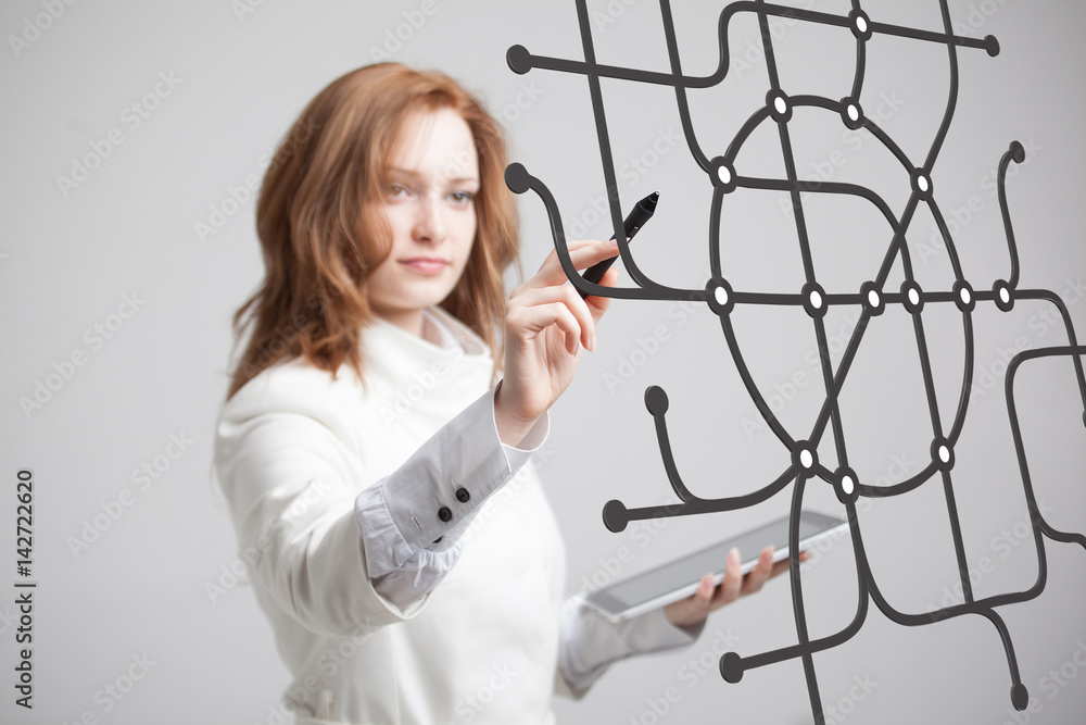 Woman specialist and urban planner working with the interactive subway map.