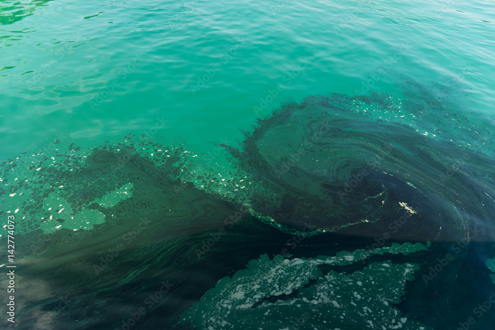 Water pollution caused by oil from fishing boats. Useful for background or texture. This environmental degradation happens when chemical pollutants are discharged into water.