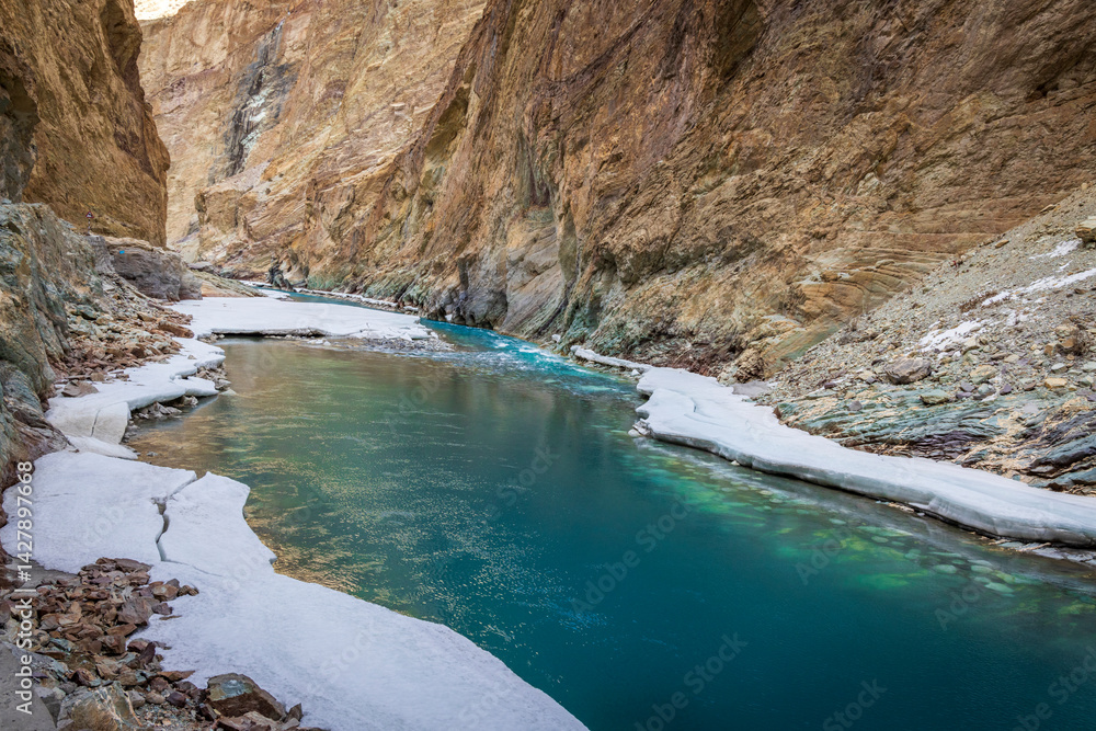 A mesmerizing view of the semi-frozen turquoise Zanskar River meandering through towering cliffs in winter, Zanskar Valley, Ladakh