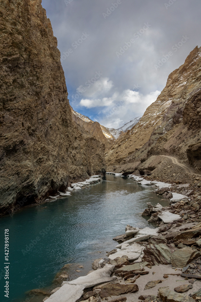 A mesmerizing view of the semi-frozen turquoise Zanskar River meandering through towering cliffs in winter, Zanskar Valley, Ladakh