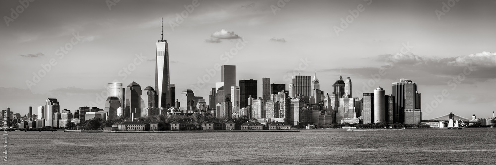 Lower Manhattan with the Financial District skyscrapers and Ellis Island. Panoramic view of New York City. Black & White