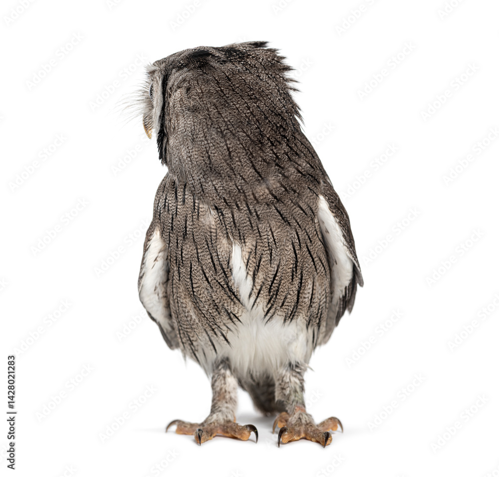 Northern white-faced owl, Ptilopsis leucotis, turning its head back and looking back, isolated on white