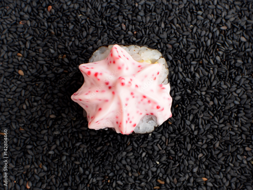 Sushi Roll with Caviar Sauce and Seaweed Nori on Dark Background